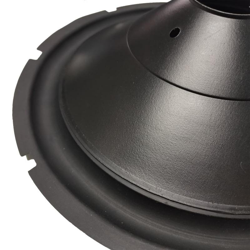 12" polypropylene cones with rubber surround are popular in both high-end and car audio speakers because they don't absorb moisture and have low distortion. Preventing moisture absorption is more important than you might think, because cone quality, quality factor, resonant frequency and cabinet tuning (in terms of ventilation design) are all affected by humidity. Conventional cones are usually manufactured by thermoforming, in which case the cone is heated until soft and then molded (usually by vacuum pressure).